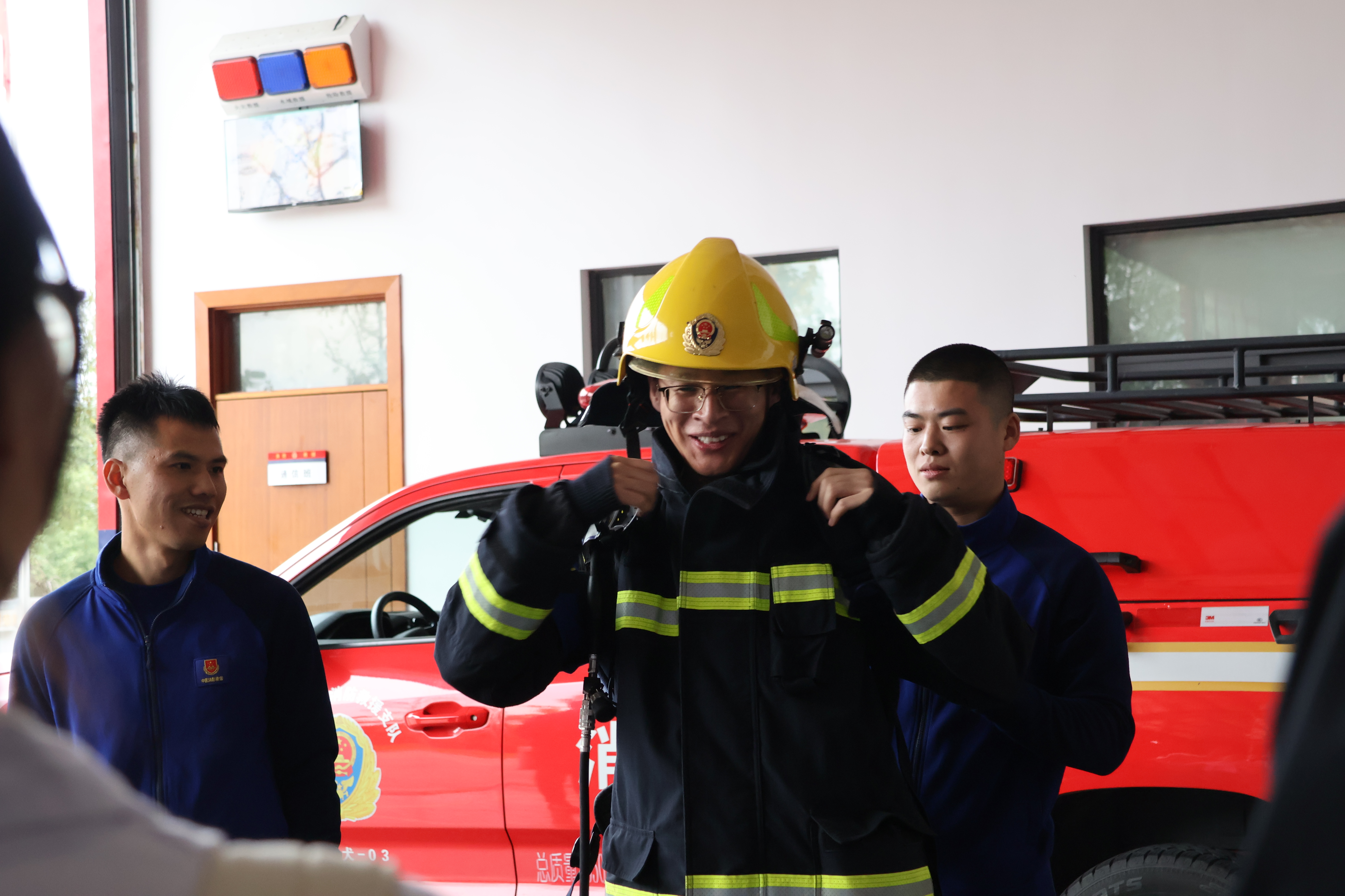 义诊活动结束后,消防员们也为服务团成员准备了一堂震撼人心的“安全教育课”。在消防知识宣讲与体验环节,服务团成员直观地了解了各类救援装备的强大功能,亲身体验了重达数十斤救援服的穿戴过程,在听到“原地着灭火救援战斗服20秒合格”时,大家都深刻感受到时间在救援中的重要性,同时服务团成员还观摩了紧张的高空救援行动和聪慧的搜救犬表演。消防员们精湛的技能、严明的纪律和为守护生命财产安全“负重前行”的担当精神,深深触动了每一位学子。