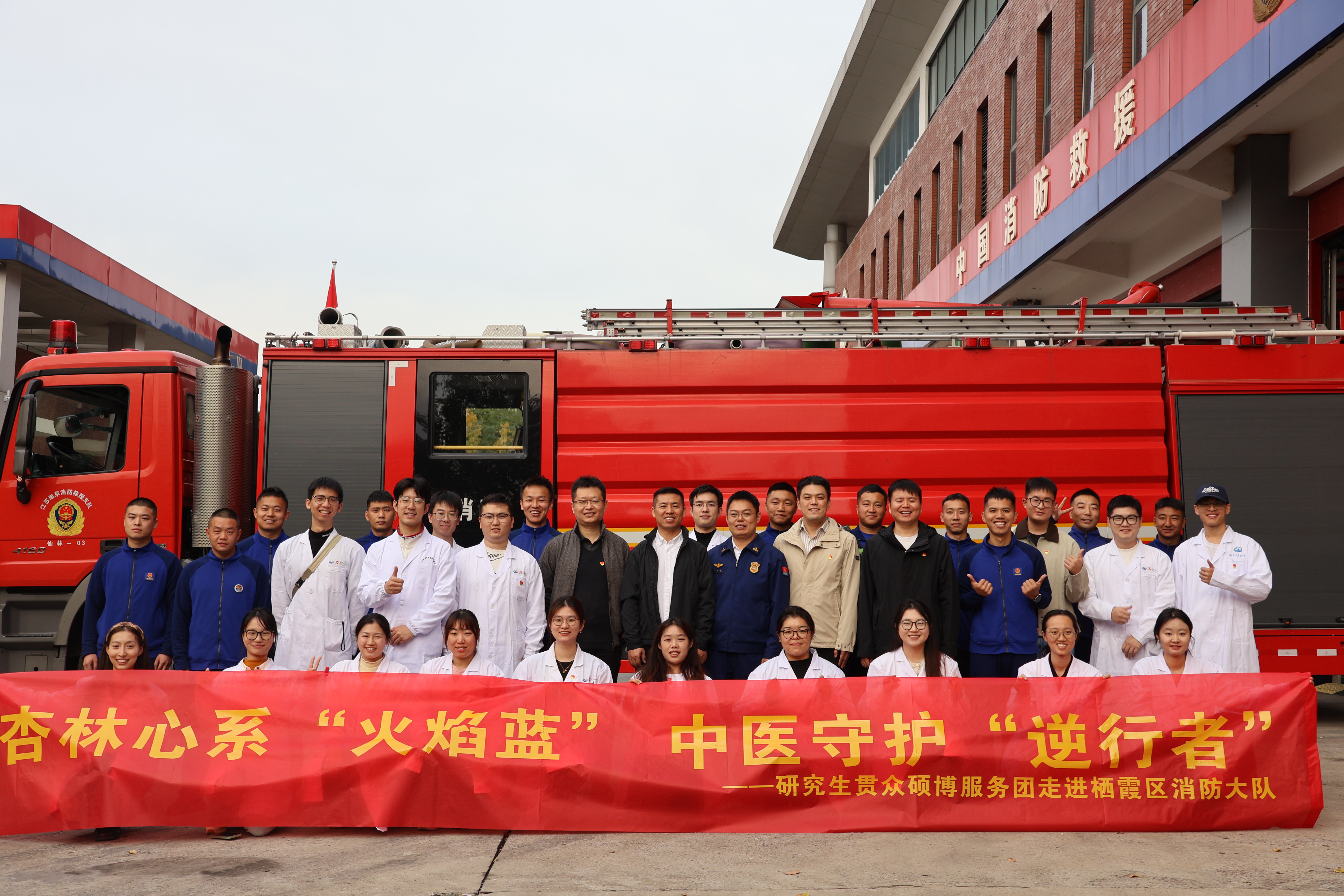 在我国第34个全国消防宣传月来临之际,南京中医药大学研究生贯众硕博服务团于10月29日走进南京市栖霞区消防大队,开展以“杏林心系‘火焰蓝’,中医守护‘逆行者’”为主题的义诊实践活动。本次活动由党委研工部联合党委保卫部及第一临床医学院国医大师周仲瑛名医传承党支部共同发起,是推动研究生思想政治教育与社会实践相结合,促进研究生全面发展的有力举措。